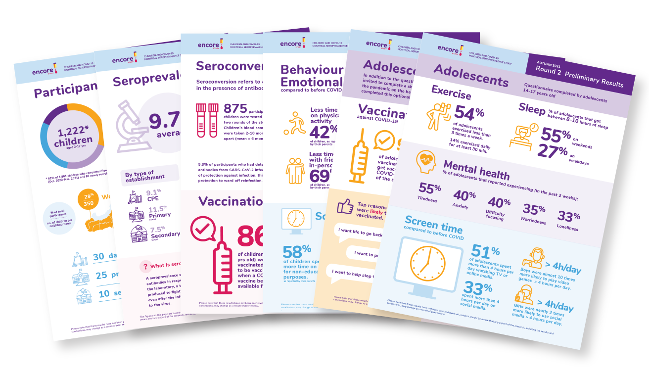 The EnCORE study is a collaborative research project between the University of Montreal and CHU Sainte-Justine which aimed to estimate the proportion of SARS-CoV-2 infections (the virus that causes COVID-19) in children aged 2 to 17 throughout the pandemic. The study also examined children’s emotional and mental health. A cross-sectional phase of the study previously assessed SARS-CoV-2 infections among school and daycare staff.